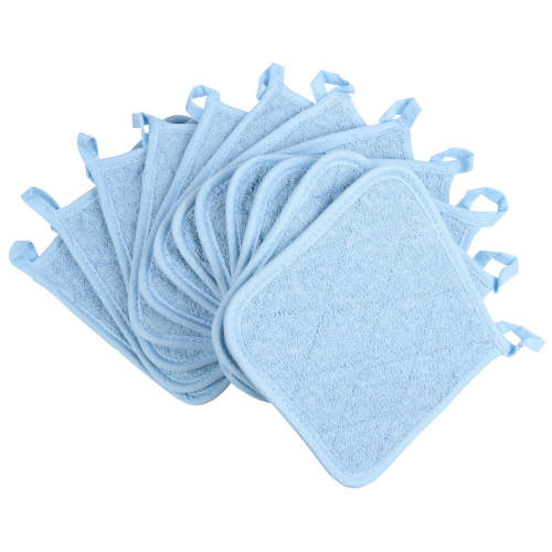 100% Cotton QUALITY: 12-pack of premium quality pot holder made up of 100% cotton (terry-looped), designed to feel soft and quilting allows for easy flexibility in these pot holders. A bulk pack of 12 make perfect for large-scale or frequent uses, offer durability and grip. A bulk pack is also more cost efficient. HEAT-RESISTANT: These pot holders will protect your hands from heat when removing dishes from the oven and hot pots from the stove, then rest your dishes on them like hot pads to protect kitchen surfaces. Do not use in a hot oven or over an open flame MULTIPURPOSE: These terry cotton oven mitts pot holders are ideal for hot pots, hot pan holder, microwave splatter guard, spoon rest, jar opener, trivet, and large coaster. Theses pot holders are perfect for business, baking, kitchen and cooking. SIZE: Our pot holders are perfect, large size - 7 x 7 in. with hemmed edges give the cloth strength and durability. It’s providing you perfect material with the benefits of heat resistant quality that you expect in your home. MACHINE WASHABLE: These pot holders are machine washable with cold water and tumble dry low (Do not bleach). Cotton makes it soft, light weight and easy to wash and can definitely hold up to multiple washes without thinning out or unraveling.