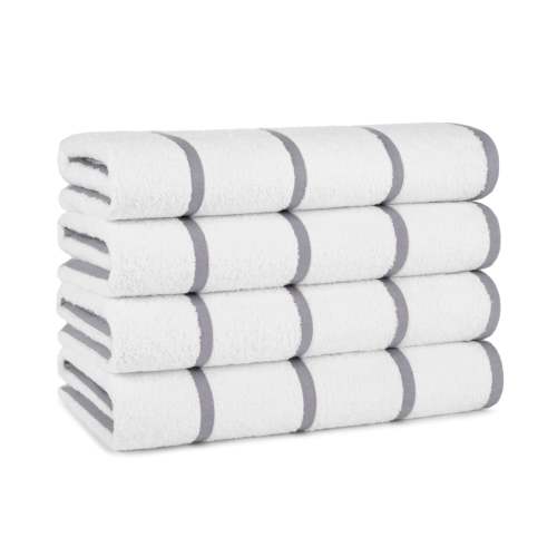 PREMIUM QUALITY BEACH TOWELS: Our Las Rayas white plush towels are made from 100% ring spun cotton and feature beautiful flat-woven horizontal stripes. ABSORBENT AND SOFT WHITE TOWELS: This 480 GSM luxury bath towel set of four is thick, soft, and absorbent. Our white beach towels wick water away fast and are considered a quick dry towel. BEAUTIFUL DESIGNED POOL TOWELS: Las Rayas luxury towels are beach, pool, or bath towels for adults. Optically bright white fluffy towels with sophisticated, colorful bath towel stripes. MULTIPURPOSE BATH TOWELS: Whether you're looking for hotel towels for bathrooms, spa towels, hotel spa towels, personal shower towels, travel beach towels, swim towels for your pool, or just a decorative bath towel, Las Rayas is one luxury towel that you cannot ignore. TERRY TOWEL CARE INSTRUCTIONS: Our large beach towels can be machine washed in a regular cycle with like colors. The colored stripes won't bleed. Our large beach towel stays soft and looks vibrant after many washes.